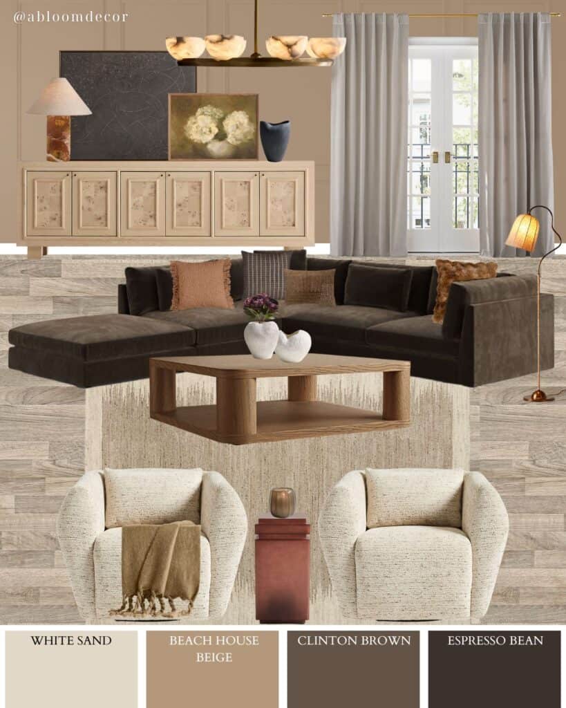 This cozy living room mood board combines warm neutrals, soft textures, and a dark brown sectional to create a space that feels calm, stylish, and perfectly lived-in. The mix of espresso brown, beige, and creamy sand tones makes this room feel grounded — the kind of space where everyone instantly feels at home.