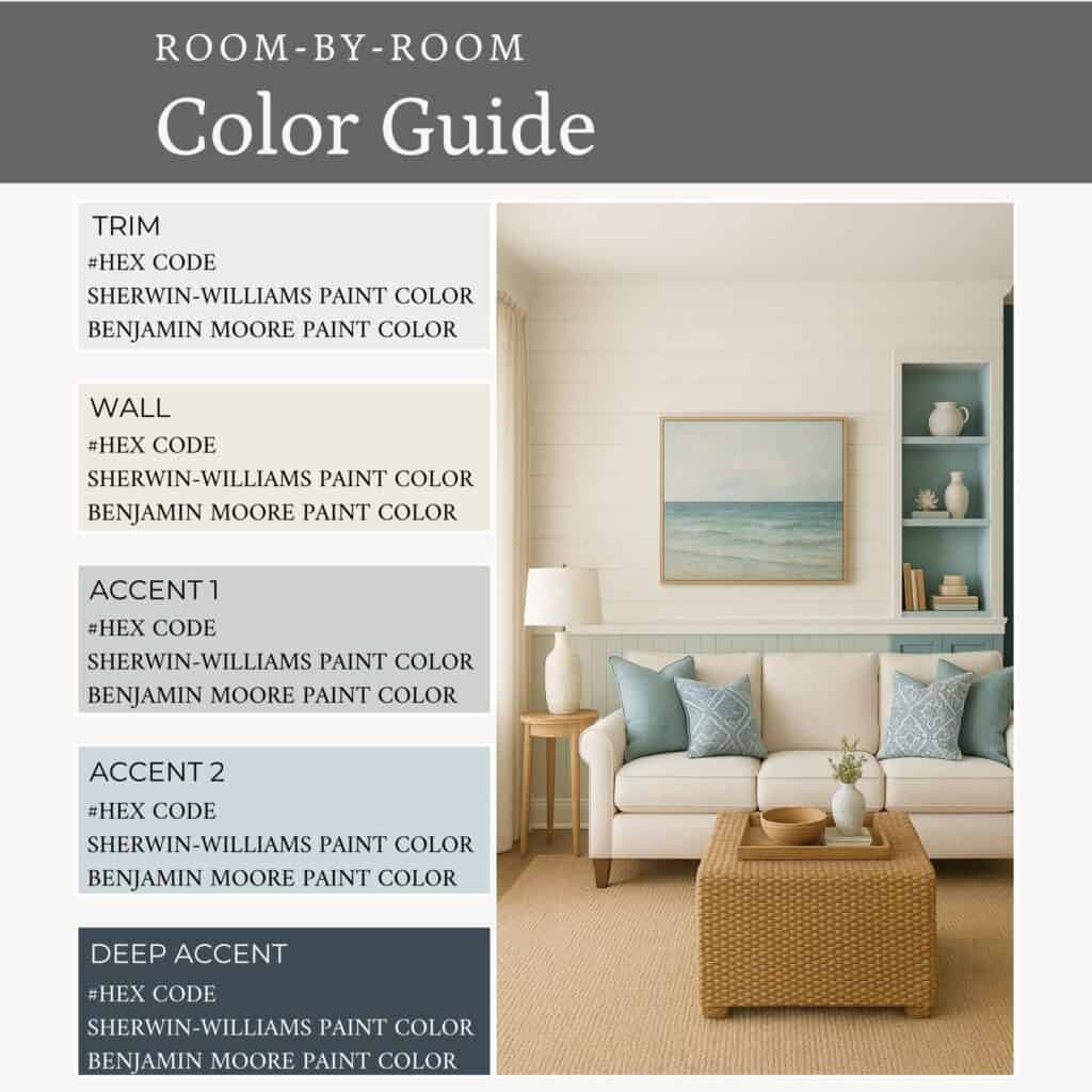 That’s why I created the Coastal Whole House Color Palette. This isn’t just a handful of swatches—it’s a designer-approved roadmap that shows you exactly which colors to use where, so your entire home feels warm, cozy, and pulled-together.