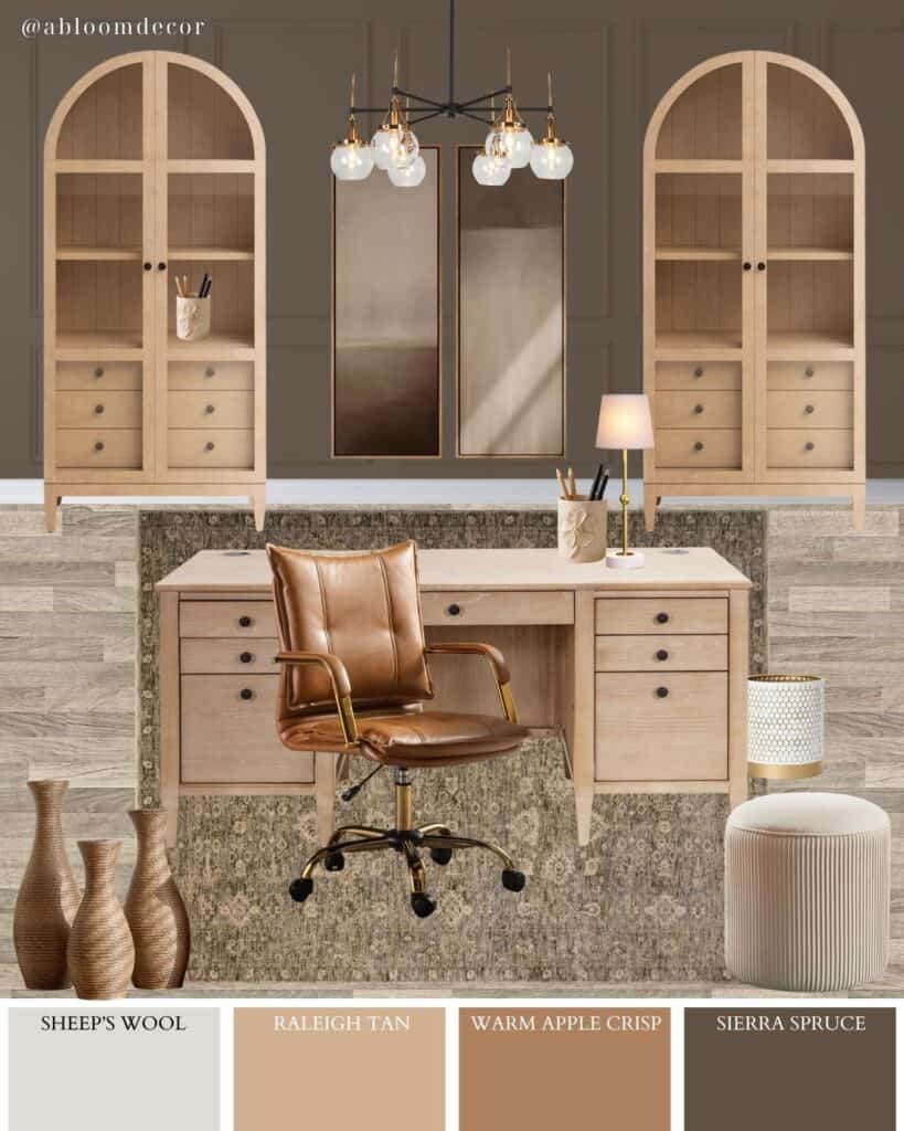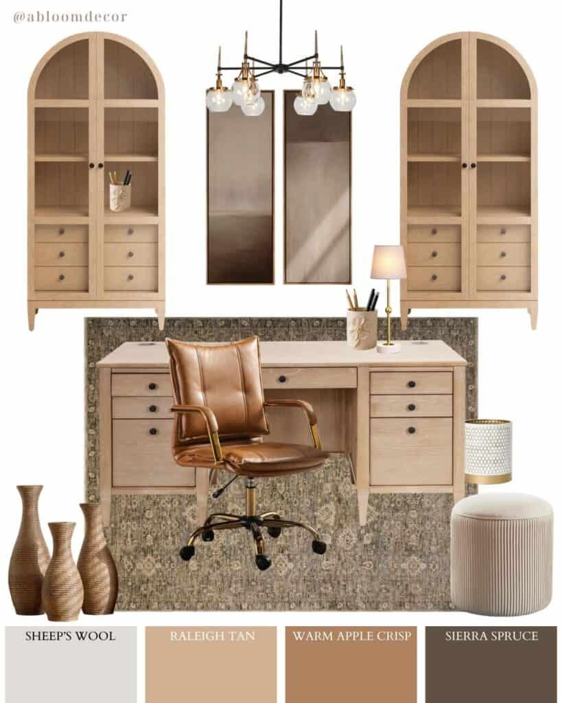 This mood board gives warm, cozy home-office vibes with light wood pieces, rich tan accents, and pretty black-and-brass details that keep it polished (not boring).