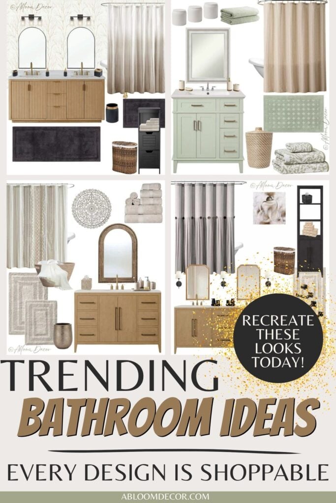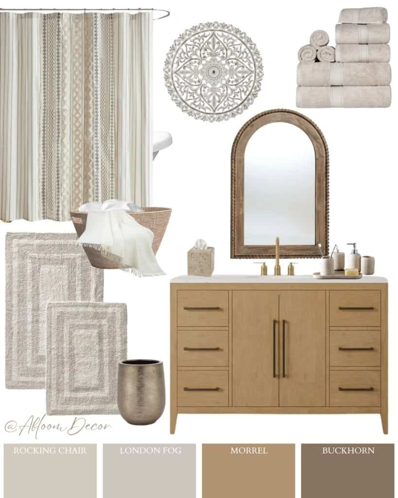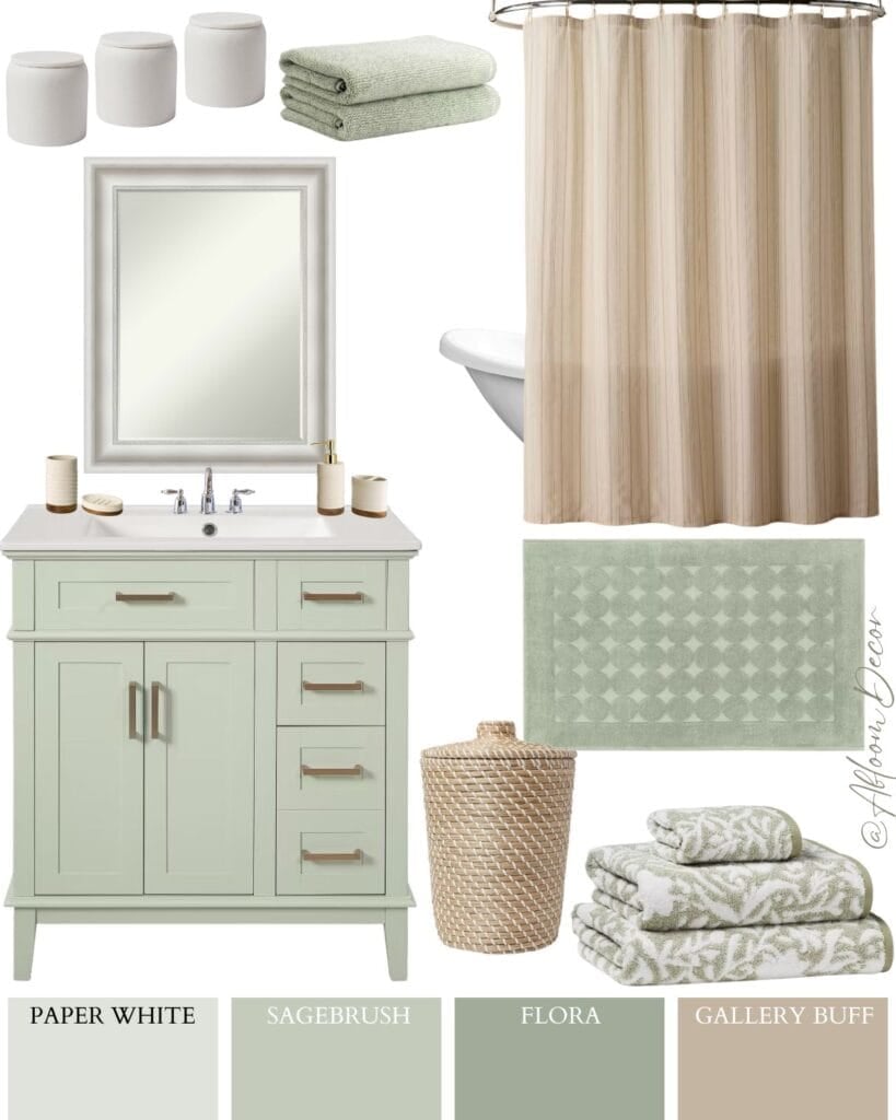 8. This bathroom mood board features a sage green draped shower curtain and neutral accents. The woven rug and rattan details keep it warm and lived-in.