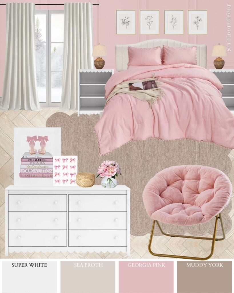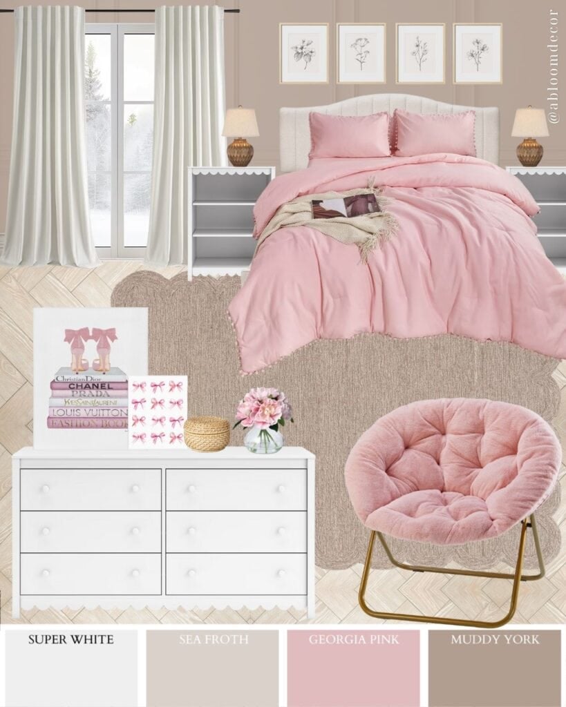Then I layered in that pretty blush bedding and a super cozy chair to make the room feel fun and inviting. The finishing touches are what make it feel personal: simple botanical prints for a clean look, and a few fashion-inspired accents for that confident, “this is my space” vibe.