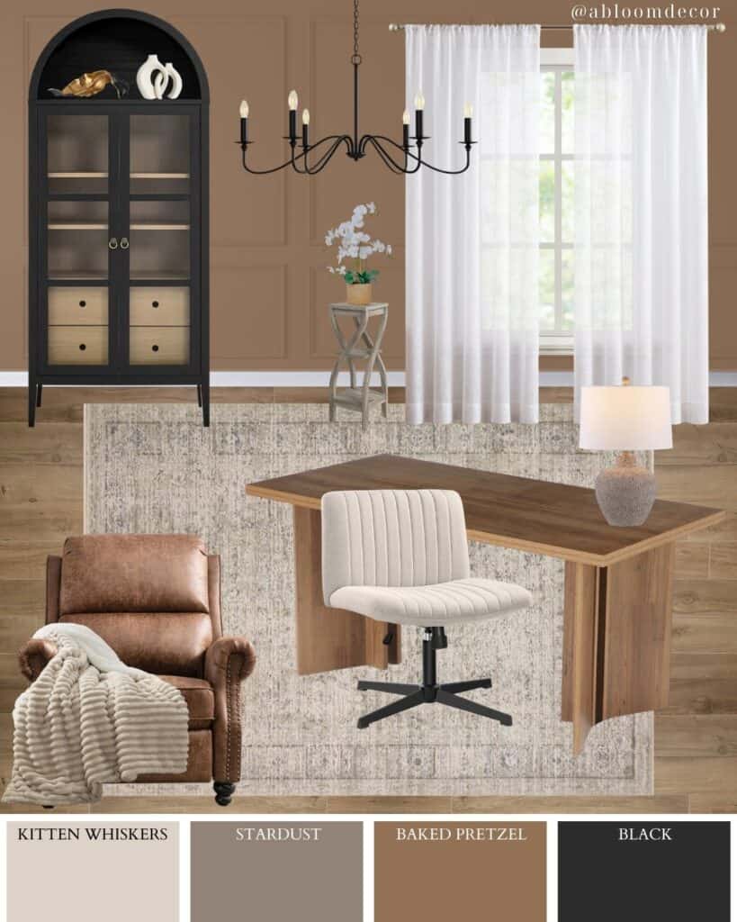 This cozy home office design blends warm browns, soft neutrals, and black accents for a comfortable and sophisticated space. The mix of textures, from the leather chair to the sleek black cabinet, creates a perfect room for productivity and comfort.