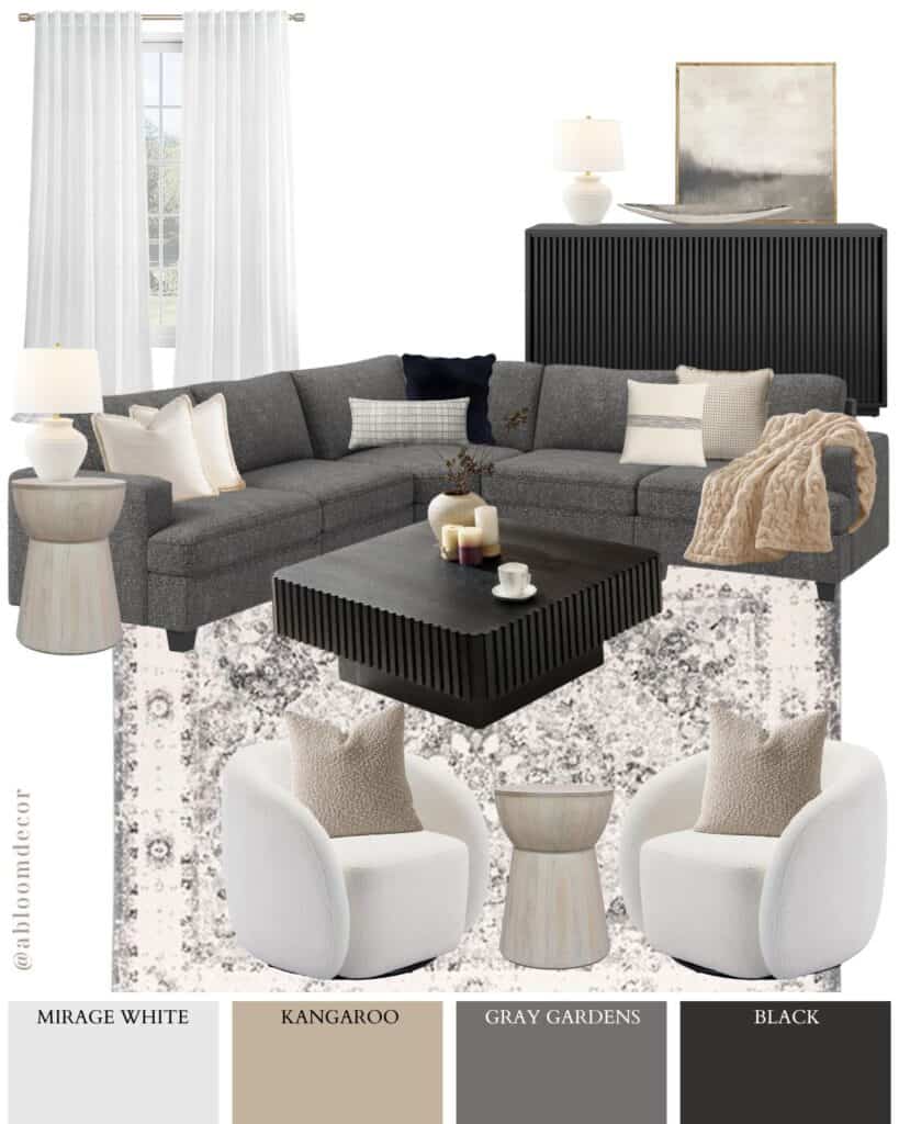 This living room mood board is cozy and modern, mixing soft white with sleek black accents. It’s the kind of space that feels inviting while still looking polished and put-together.